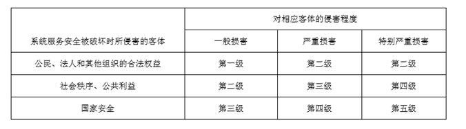 根據(jù)系統(tǒng)服務(wù)安全被破壞時(shí)所侵害的客體以及對(duì)相應(yīng)客體的侵害程度,依據(jù)下表即可得到系統(tǒng)服務(wù)安全保護(hù)等級(jí):