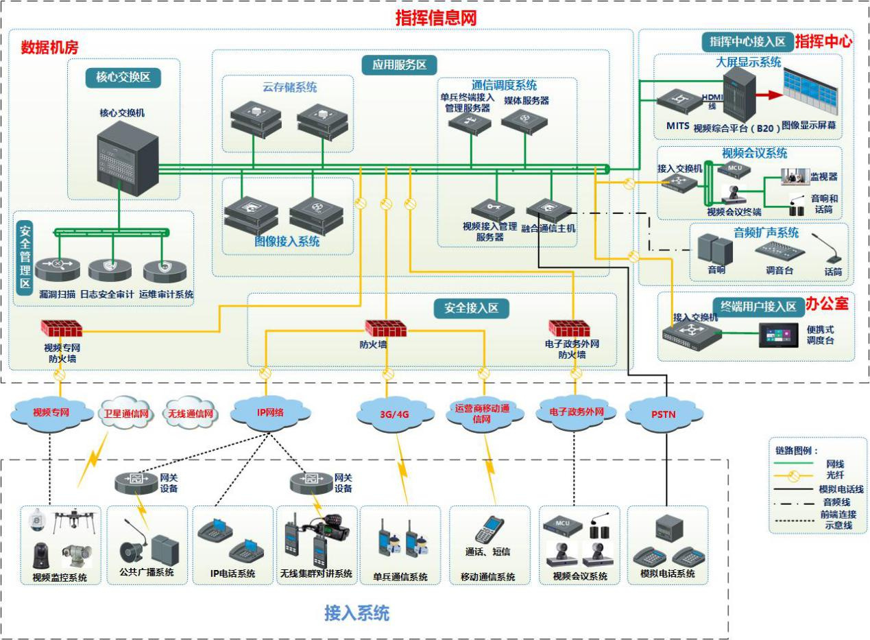 指揮中心的圖像接入系統(tǒng)、通信調(diào)度系統(tǒng)、視頻會議系統(tǒng)均可以單獨(dú)工作,并且能夠?qū)崿F(xiàn)部、省、市、縣聯(lián)網(wǎng)。其中在省/市等部門指揮中心,圖像接入系統(tǒng)、通信調(diào)度系統(tǒng)、視頻會議系統(tǒng)之間以及與大屏顯示系統(tǒng)及音頻擴(kuò)聲系統(tǒng)之間根據(jù)業(yè)務(wù)需要進(jìn)行系統(tǒng)對接。在無線通信網(wǎng)、電子政務(wù)外網(wǎng)、衛(wèi)星通信網(wǎng)上的各類視頻、音頻、數(shù)據(jù)采集類設(shè)備或者行業(yè)平臺,通過安全設(shè)備接入指揮信息網(wǎng),實(shí)現(xiàn)與圖像接入系統(tǒng)、通信調(diào)度系統(tǒng)等對接。業(yè)務(wù)架構(gòu)示意圖如下: