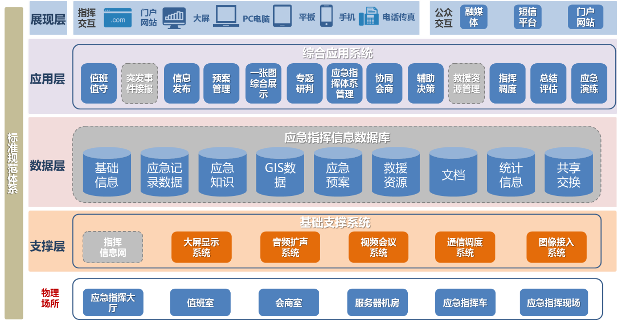 系統(tǒng)設(shè)計(jì)參照應(yīng)急管理部發(fā)布的應(yīng)急指揮信息系統(tǒng)建設(shè)任務(wù),整體架構(gòu)如下,包括支撐層、數(shù)據(jù)層、應(yīng)用層、展現(xiàn)層。