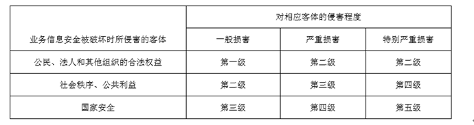 根據(jù)業(yè)務(wù)信息安全被破壞時所侵害的客體以及對相應(yīng)客體的侵害程度,依據(jù)下表即可得到業(yè)務(wù)信息安全保護(hù)等級: