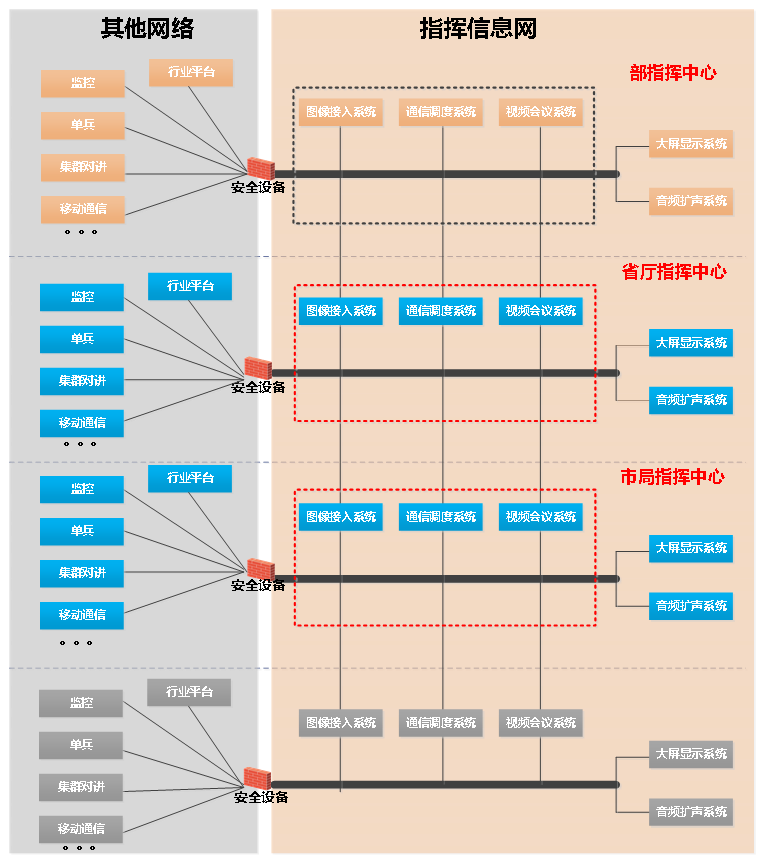 指揮中心的圖像接入系統(tǒng)、通信調(diào)度系統(tǒng)、視頻會(huì)議系統(tǒng)均可以單獨(dú)工作,并且能夠?qū)崿F(xiàn)部、省、市、縣聯(lián)網(wǎng)。其中在省/市等部門指揮中心,圖像接入系統(tǒng)、通信調(diào)度系統(tǒng)、視頻會(huì)議系統(tǒng)之間以及與大屏顯示系統(tǒng)及音頻擴(kuò)聲系統(tǒng)之間根據(jù)業(yè)務(wù)需要進(jìn)行系統(tǒng)對(duì)接。在無(wú)線通信網(wǎng)、電子政務(wù)外網(wǎng)、衛(wèi)星通信網(wǎng)上的各類視頻、音頻、數(shù)據(jù)采集類設(shè)備或者行業(yè)平臺(tái),通過(guò)安全設(shè)備接入指揮信息網(wǎng),實(shí)現(xiàn)與圖像接入系統(tǒng)、通信調(diào)度系統(tǒng)等對(duì)接。業(yè)務(wù)架構(gòu)示意圖如下: