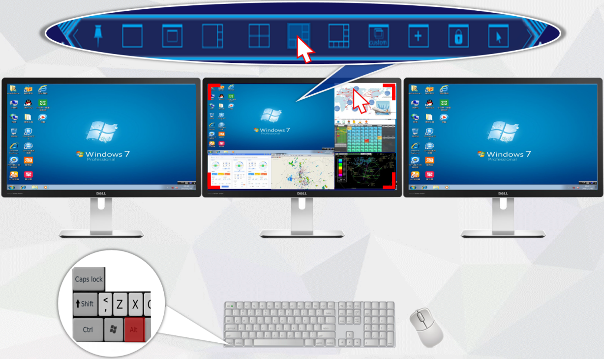 分布式坐席分屏模式可自由切換,并且每個(gè)漫游開(kāi)窗的信號(hào)源都可以進(jìn)行雙擊放大直接操作該電腦的一切功能,再次雙擊切換回多個(gè)小窗口監(jiān)控模式。